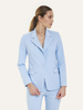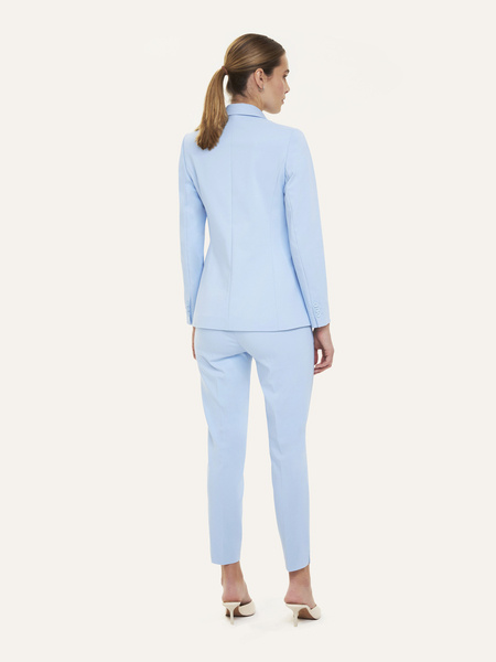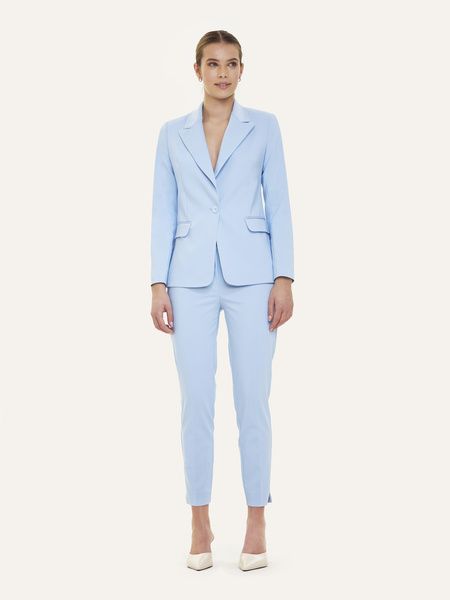 - Klasyczna dopasowana marynarka zapinana na jeden guzik z tkaniny bawełnianej w kolorze niebieskim. Wykładany kołnierz z klapami. Kieszenie z patkami. Model na podszewce.