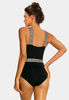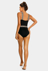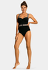 Jednoczęściowy czarny strój kąpielowy ze złotymi gumami
