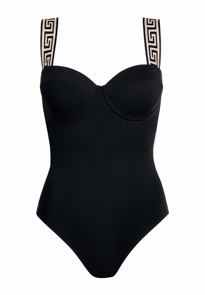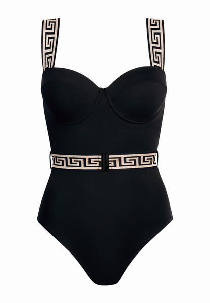 Kostium kąpielowy w całości uszyty z jednolitej czarnej, gładkiej tkaniny wzbogacony ozdobnymi, grubymi gumami w kolorze złotym. Model FL28 to strój kąpielowy jednoczęściowy typu bardotka z miseczką usztywnianą na fiszbinie. Wewnątrz miseczek znajduje się umieszczony na stałe push-up, jego główną funkcją jest uniesienie i optyczne powiększenie piersi. Biustonosz kąpielowy push-up w formie bardotki wyróżnia się spośród innych modeli, nieco innym krojem miseczek - są ułożone w linii poziomej już u samej podstawy biustonosza. Powstaje dzięki temu wyjątkowo stabilna konstrukcja, która podkreśla biust i dobrze go trzyma. Ozdobne ramiączka w formie grubej, elastycznej gumy dobrze trzymają całość i nadają charakterystycznego stylu dla Versace. Kostium bez zapięcia (wsuwany), plecy wysoko zabudowane, tył pełny. Model posiada odpinany pasek, który ładnie komponuje się z ramiączkami w tym samym wzorze. Został wykończony ozdobną klamrą w korze złotym, jest bardzo elastyczny, przyciąga uwagę, pięknie podkreśla talię i nadaje odpowiednich proporcji sylwetce. Wyjątkowy krój bardotki, jeden z najmodniejszych w tym sezonie. Czarny strój kąpielowy jednoczęściowy FL27/876 to idealna propozycja dla pań lubiących klasyczne kolory, lecz w nowoczesnej, ciekawej odsłonie.