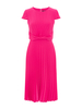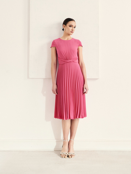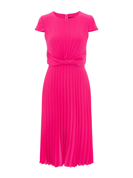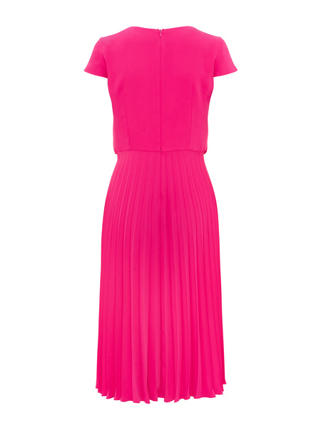 - Sukienka o poszerzanym kroju z gładkiej tkaniny w kolorze fuksji. W całości plisowana. Zapinana z tyłu na kryty zamek. Okrągły dekolt. Krótkie rękawy. Ozdobny pas. Model bez podszewki.