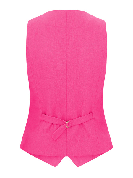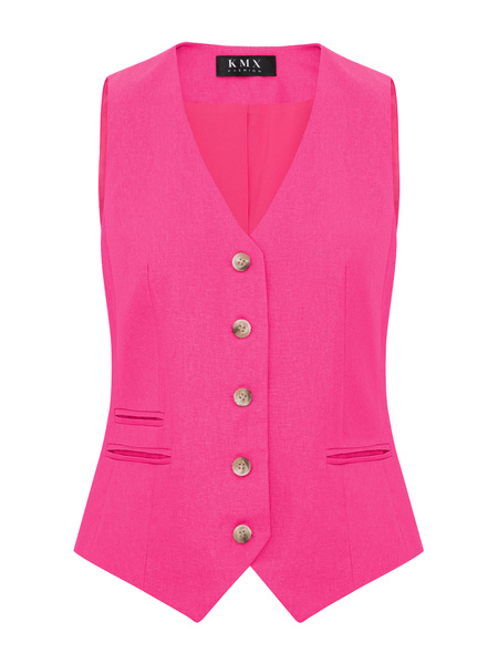 - Kamizelka o taliowanym kroju z elastycznego lnu w kolorze różowym. Zapinana na ozdobne guziki. Kieszenie z pasplami. Model na podszewce.