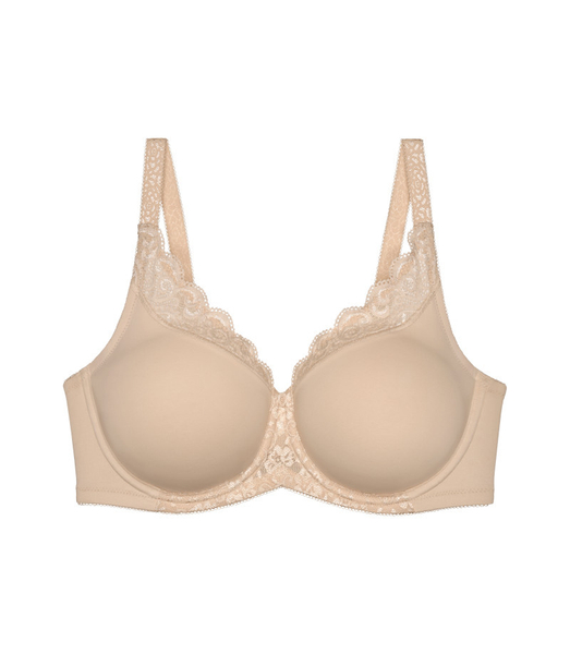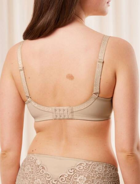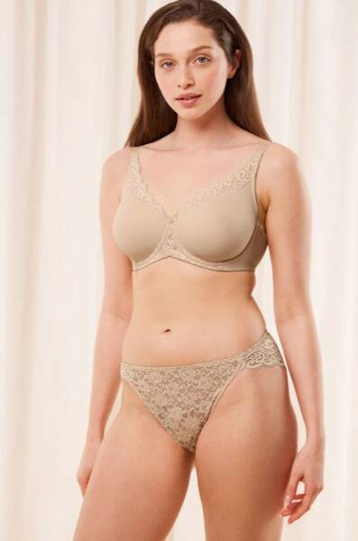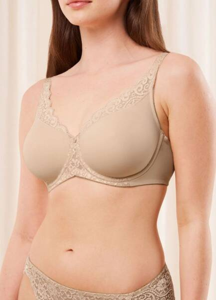Biustonosz typu Minimizer z fiszbinami, optycznie zmniejsza biust o jeden rozmiar miseczki. Boczna część stanika z delikatnej i gładkiej mikrofibry. Nowe miękkie elastyczne taśmy na wewnętrznym brzegu miseczki. Delikatne i gładkie szwy dla ostatecznego komfortu. Nowe, ergonomiczne wykończenie z tyłu typu V dla dodatkowego komfortu i wsparcia. Biustonosz w kolorze cielistym.