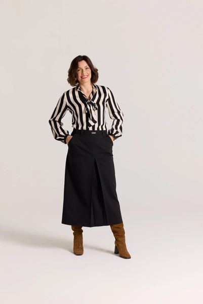 Czarna spódnica firmy Salko o trapezowym kroju z kontrafałdą to klasyczna i stylowa propozycja, idealna na różne okazje. Trapezowy krój sprawia, że spódnica subtelnie rozszerza się ku dołowi, co zapewnia wygodę i lekko podkreśla talię. Kontrafałda dodaje elegancji i nieco struktury, nadając spódnicy nowoczesny wygląd. Taki model świetnie sprawdzi się zarówno w formalnych stylizacjach z koszulą czy marynarką, jak i w bardziej casualowych zestawach z lekkim swetrem lub bluzką.