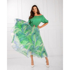 Sejla to zachwycająca, elegancka sukienka hiszpanka. Spojrzenia przyciąga nie tylko efektowny krój, ale także jej piękna, oryginalna kolorystyka. Góra kreacji uszyta jest z delikatnej tafty w cudownym odcieniu zieleni. Szyfonowy dół to idealnie dopasowana malownicza paleta chłodnych barw pastelowych. Fason sukienki jest doskonały dla niemal wszystkich typów sylwetki. Rozkloszowany, zwiewny dół dodaje figurze lekkości. Podkreślona talia akcentuje wcięcie w pasie. Całość świetnie wyrównuje proporcje sylwetki i w zależności od potrzeb pomoże zamaskować zbyt obfite biodra lub dodać w tych rejonach nieco objętości. Zmysłowy dekolt hiszpański jest wykończony efektownym marszczeniem. Można nosić na różne sposoby, co stwarza różnorodne możliwości stylizacyjne: świetnie prezentuje się zarówno zsunięty, jak i nasunięty na ramiona. Stylowy elastyczny pasek z ozdobną klamrą dodatkowo podkreśla wcięcie w talii. Uniwersalna i elegancka długość midi sprawdzi się podczas każdej okazji. Bardzo modnym akcentem w tej sukience są bufiaste rękawki o długości do łokcia. Model posiada podszewkę, która w składzie ma 100% wiskozy.