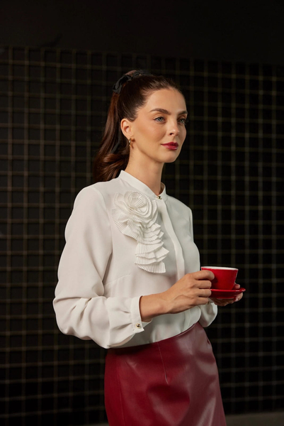 Elegancka bluzka z kotylionem. Dostępna w dwóch kolorach: biały i czarny.