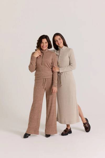 Spódnica z przyjemnej dzianiny. Dostępna w kolorze bezowym.