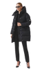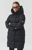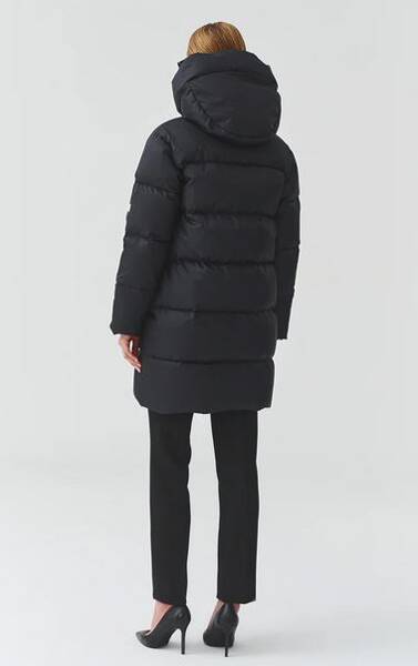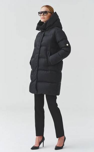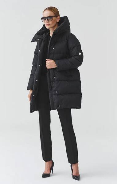 Kurtka średniej długości zapinana na dwukierunkowy suwak. Duży kaptur pełni również funkcję otulające stójki.