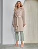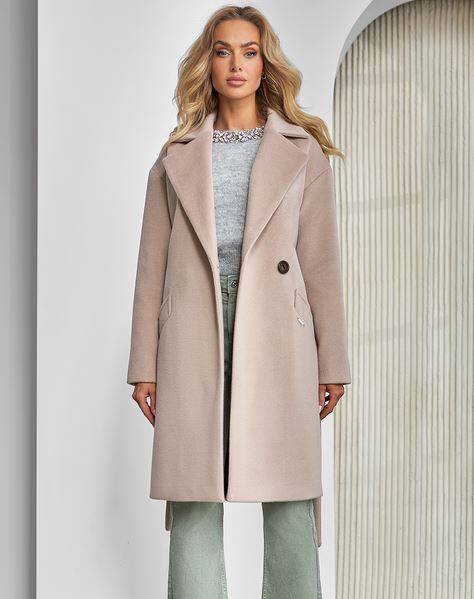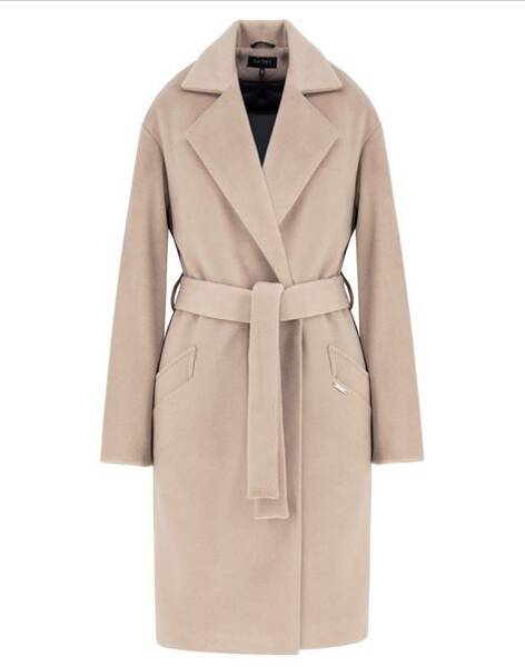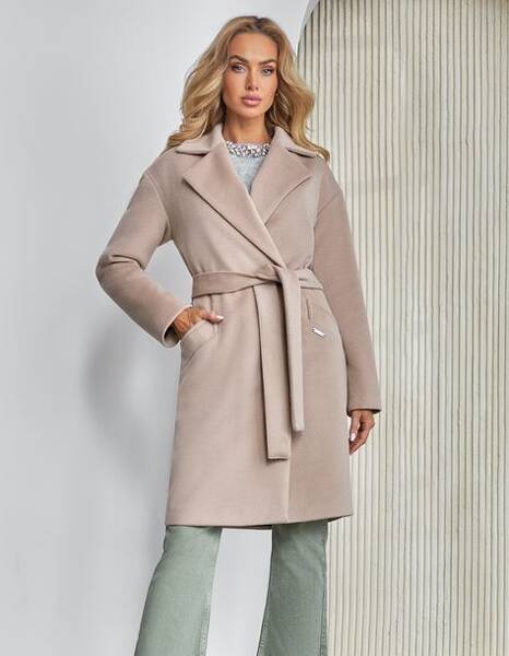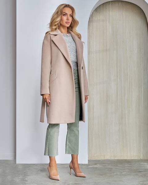 Model o luzniejszym fasonie z kołnierzem i klapami. Zapinany na guziki, regulowany w talii paskiem, opuszczona linia ramion. Po bokach kieszenie. Z tyłu rozporek. Zimowy, ocieplany płaszcz o długości przed kolano, wykończony podszewką.