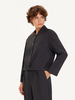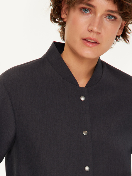 - Bomber o prostym kroju z elastycznej tkaniny wiskozowej w kolorze grafitowym. Zapinany z przodu na napy. Kołnierzyk na stójce. Długie rękawy. Dół wykończony ściągaczem. Z przodu ozdobne zaszewki. Model na podszewce.