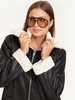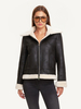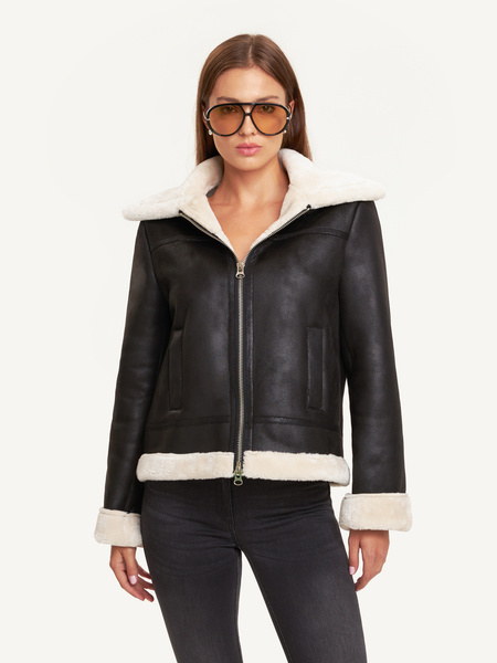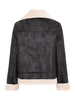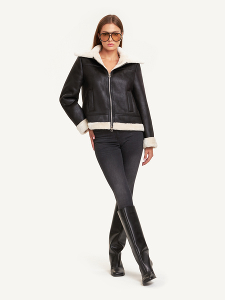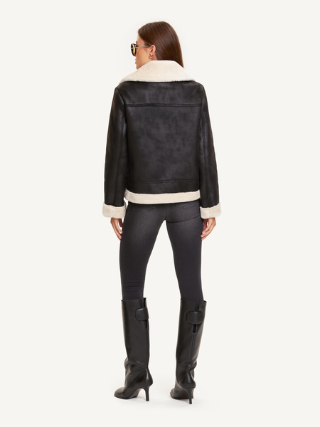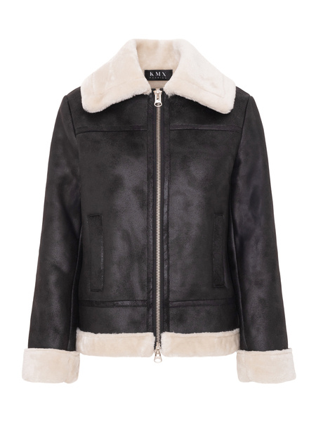 - Kożuch o prostym kroju w kolorze czarnym zapinany z przodu na dwustronny ozdobny zamek. Wykładany kołnierz. Długie rękawy. Kieszenie z przodu. Wewnętrzna strona w kolorze ecru.