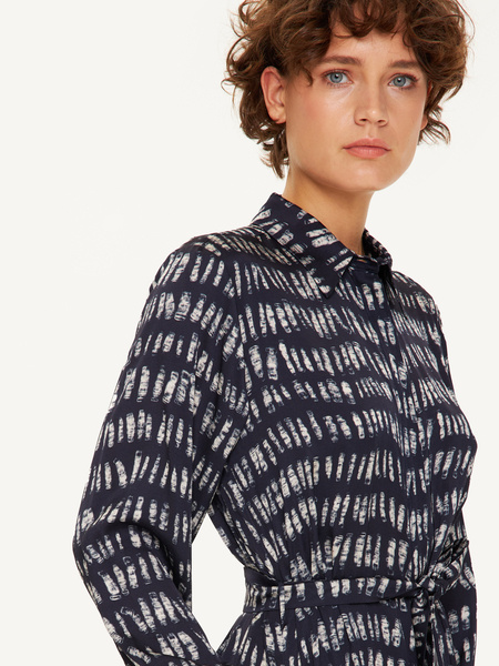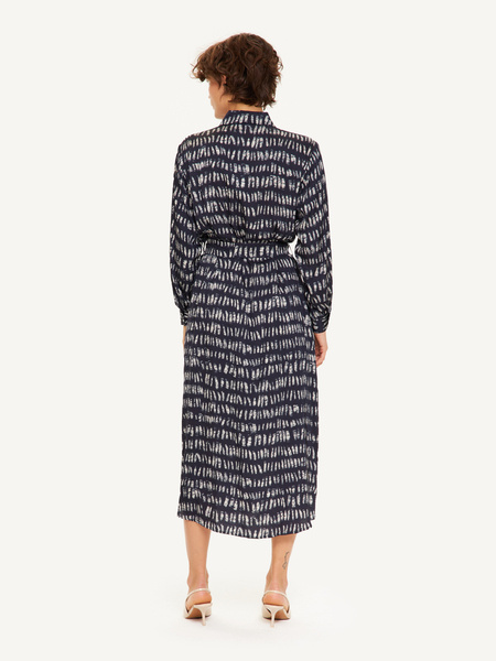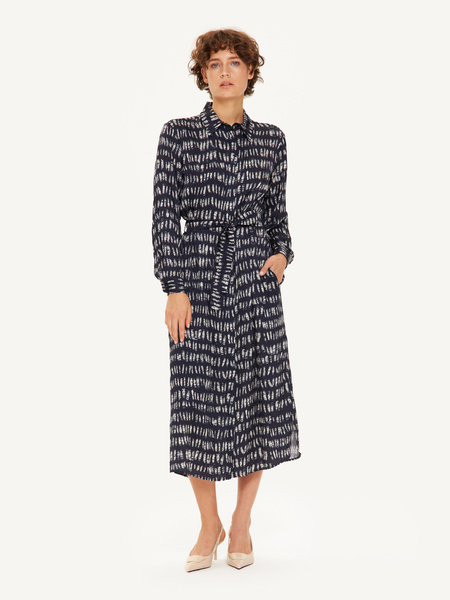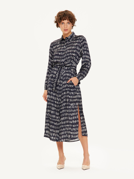 - Sukienka o prostym kroju z wiskozy w kolorze granatowym we wzory. Wykładany kołnierzyk. Zapinana z przodu na guziki. Pasek do kompletu. Kieszenie po bokach. Długie rękawy z mankietami. Dół z rozcięciami. Model bez podszewki.