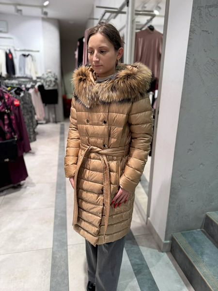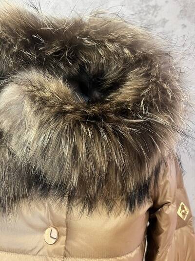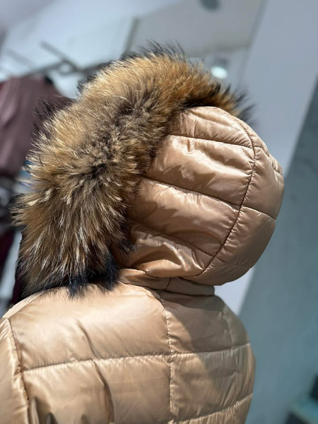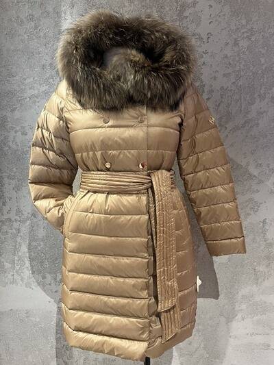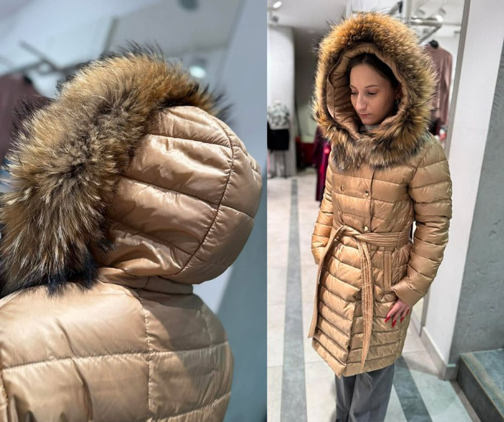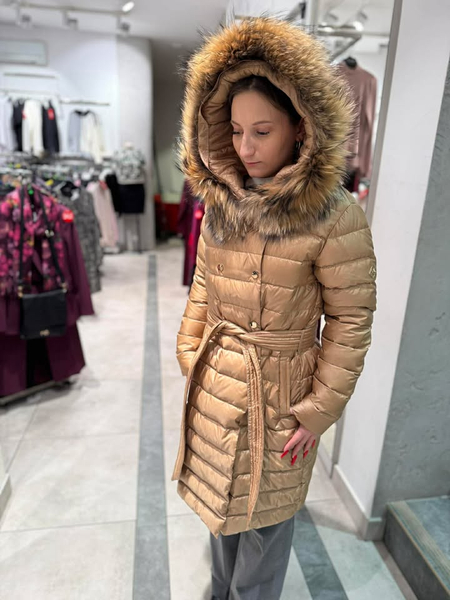Nowoczesna i efektowna kurtka o wydłużonej formie. Wykonana z tkaniny poliestrowej o delikatnym połysku. Wypełnienie naturalnym pierzem zapewnia doskonałą ochronę przed chłodem, wiatrem i mrozem. Modne pikowania potęgują efekt ochrony przed zimnem. Prosty krój. Obszerny dosuwany kaptur wykończony dosuwaną listwą z naturalnego futra z jenota gwarantuje elegancki i luksusowy wygląd ale też dodaje ożywienia. Całość zapinana na napy oraz nylonowy pasek. Posiada dwie wpuszczone kieszenie. Długość płaszcza gwarantuje ciepło w dolnej partii sylwetki. Prosta, uniwersalna forma sprawdza się w wielu połączeniach – zarówno ze stylem eleganckim, jak i sportowym. Wygląda również dobrze na różnych typach sylwetek. Ponadczasowy fason sprawdzi się przez wiele lat.
