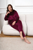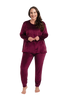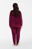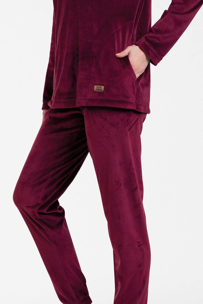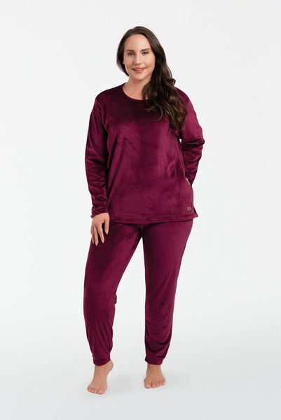 Komplet o prostej linii. W bluzie okrągły dekolt i kieszenie w bokach. Spodnie z wygodną, nieuciskającą gumą w tunelu i gumką w dole nogawek.