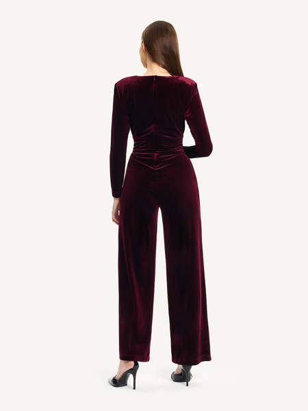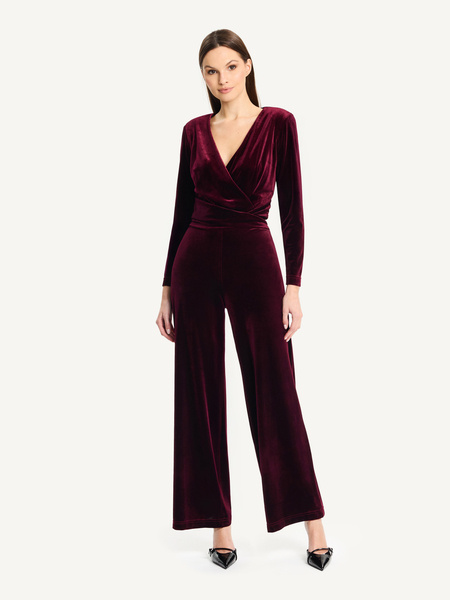 Elegancki kombinezon z poduszkami na ramionach i długimi rękawami wykonany z wysokiej jakości elastycznego weluru. Materiał o subtelnym połysku nadaje kreacji wyjątkowego charakteru, zapewniając jednocześnie komfort noszenia i idealne dopasowanie do sylwetki. Górna część kombinezonu ma kopertowy dekolt, który podkreśla linię szyi i dodaje stylizacji kobiecego uroku. W pasie znajduje się ozdobny element w formie skręconego materiału, który podkreśla talię i nadaje całości unikalnego wyglądu.