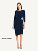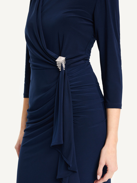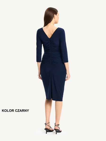 Elegancka sukienka o długości midi z rękawem 3/4, wykonana z elastycznej tkaniny, która zapewnia doskonałe dopasowanie do sylwetki. Efektowne marszczenie na plecach podkreśla figurę, dodając sukience wyjątkowego charakteru.