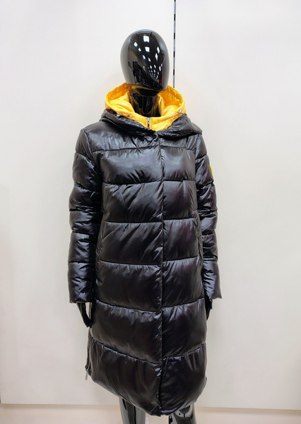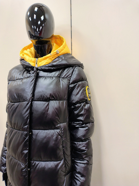 Kurtka zimowa. Żółta podpinka wraz z kapturem jest elementem, który można wypiąc za pomocą zamków.