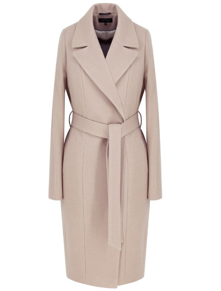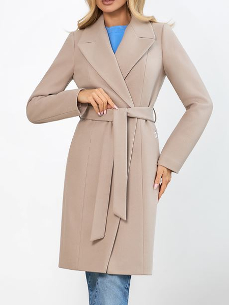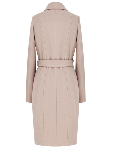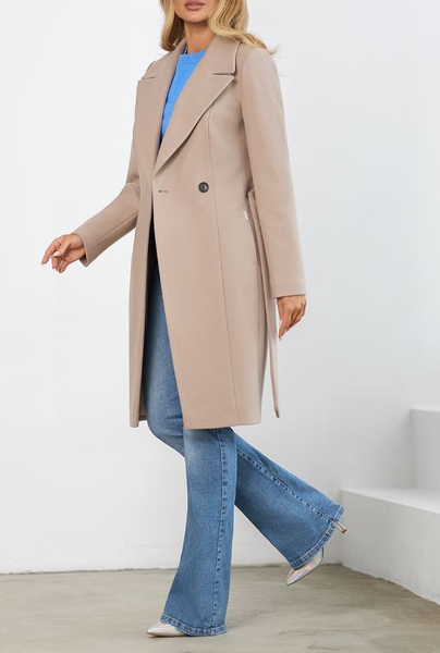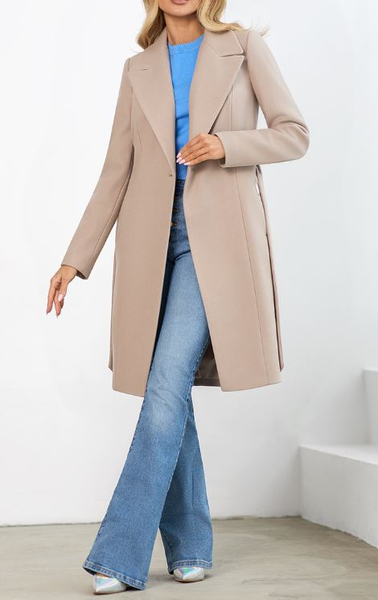 Model dopasowany z kołnierzem i klapami. Regulowany w talii paskiem. Zapinany jednorzędowo na guziki. Po bokach kieszenie. Płaszcz o długości przed kolano, wykończony podszewką.