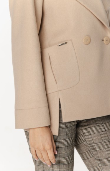 Model krótki z kołnierzem i klapami. Doskonale skrojony płaszcz o luźniejszym fasonie.  Zapinany dwurzędowo na guziki. Po bokach nakładane kieszenie. Z przodu dwa rozporki. Wiosenny, płaszcz wykończony podszewką. Model Emma będzie pasował do wszystkich codziennych stylizacji.