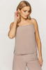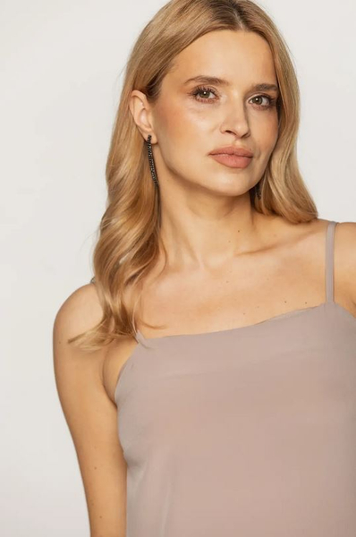 Top damski w beżowym kolorze to klasyka, która nigdy nie wychodzi z mody. Z prostym, uniwersalnym krojem i krótkimi rozcięciami na dole, idealnie pasuje do wielu różnych stylizacji. Cienkie ramiączka i lekka tkanina (100% poliester) sprawiają, że top jest wygodny i przewiewny, doskonały do noszenia samodzielnie lub jako baza do zestawów z marynarkami, żakietami czy narzutkami. Jego jednolity kolor pozwala na łatwe łączenie z innymi elementami garderoby – zarówno gładkimi, jak i wzorzystymi. To ponadczasowy element, który uzupełni każdą szafę.