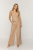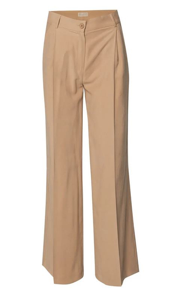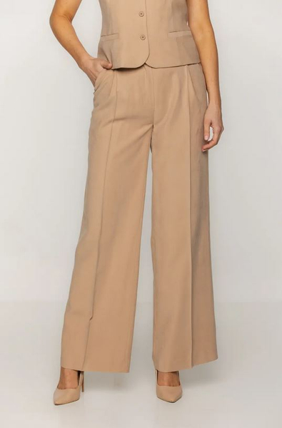 Eleganckie, szerokie spodnie z kieszeniami bocznymi, wykonane z wysokiej jakości tkaniny (92% wiskoza, 8% poliester). Dzięki szlufkom w talii, spodnie można nosić z paskiem, co dodatkowo podkreśla sylwetkę. Zapięcie na suwak i guzik zapewnia wygodę i precyzyjne dopasowanie. Ich luźny krój i elegancki charakter sprawiają, że doskonale nadają się zarówno na formalne, jak i codzienne stylizacje, łącząc komfort z szykiem.