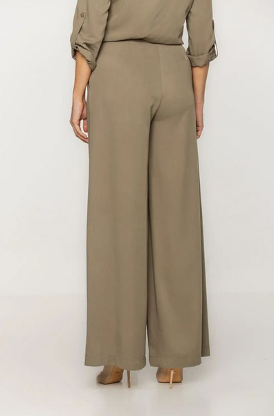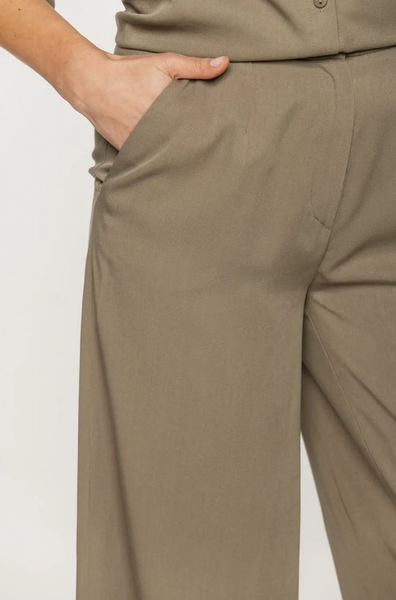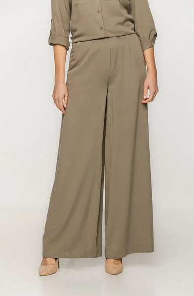 Długie spodnie w odcieniu oliwkowej zieleni, wykonane z lekkiej i przewiewnej tkaniny wiskozowej (100% wiskoza), to doskonały wybór na cieplejsze dni. Klasyczny fason z prostą nogawką został uzupełniony o praktyczne boczne kieszenie oraz zapięcie na guzik i suwak. Naturalna tkanina zapewnia komfort noszenia, a stonowany kolor łatwo dopasujesz do wielu elementów garderoby – od casualowych topów po eleganckie koszule.