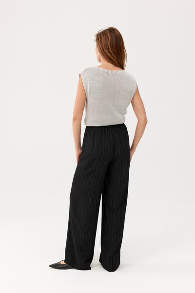 Eleganckie spodnie z szeroką nogawką, które łączą klasykę z nowoczesnym stylem. Dzięki subtelnemu połyskowi materiału i lekkości wiskozowej tkaniny, model doskonale sprawdzi się zarówno w codziennych, jak i bardziej formalnych stylizacjach. Szerokie nogawki dodają lekkości sylwetce, a elastyczny pas gwarantuje komfort noszenia.