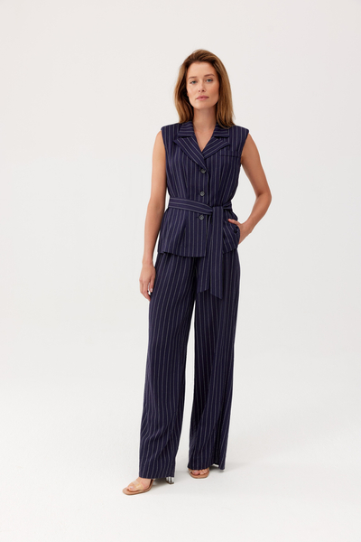 SKŁAD: Rayon 80% Len 20% Opis: Casualowo-wizytowe spodnie z szeroką nogawką. Wykonane z tkaniny typu rayon z domieszką lnu w subtelny prążek. Krój prosty o szerokiej nogawce. W szwach bocznych kieszenie. W tali ułatwiająca dopasowanie do sylwetki gumka. W zestawie z kamizelką z kolekcji FERIA tworzy efektowny sportowy outfit.