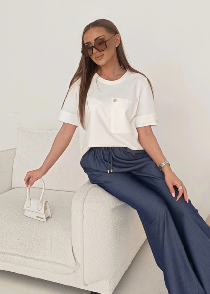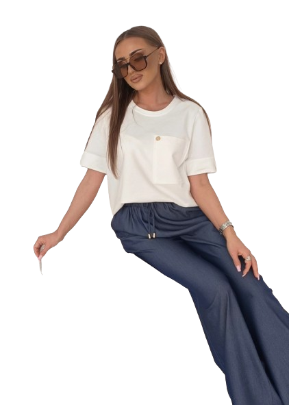 Krótka bluza o lekko pudełkowym kroju, wykonana z gładkiej, mięsistej tkaniny o matowym wykończeniu. Posiada klasyczny, zaokrąglony dekolt, który subtelnie podkreśla linię szyi. Rękawy o długości do łokcia zakończone są szerokim mankietem, nadającym im elegancki charakter. Na lewej piersi umieszczona została ozdobna kieszonka z minimalistycznym metalowym detalem w złotym kolorze. Dół bluzki jest prosty, delikatnie usztywniony, co sprawia, że fason utrzymuje swój kształt i efektownie układa się na sylwetce.
