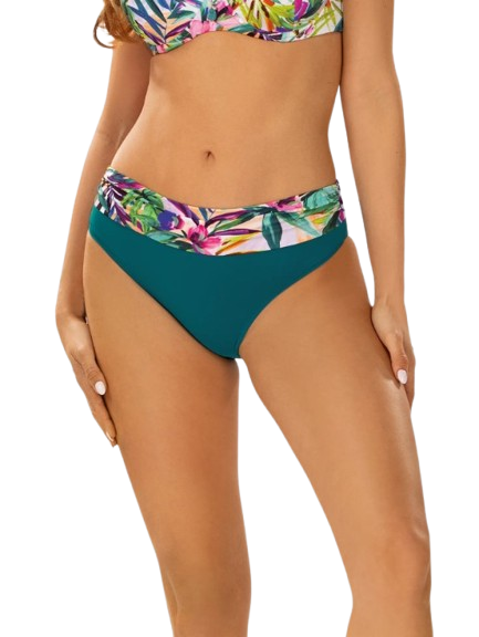 Model FD10/904 to figi kąpielowe z podwyższonym stanem, które świetnie komponują się z każdą sylwetką dzięki swoim specjalnym cechom. Tropikalny print dodaje egzotycznego klimatu i świetnie pasuje do letnich stylizacji plażowych. Ozdobny pas skutecznie modeluje talię, tworząc harmonijną sylwetkę, podczas gdy podwyższony stan zapewnia wygodę i dodatkowe wsparcie (pas nie wywija się na zdjęciu widoczna jego maksymalna wysokość).