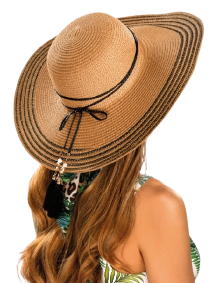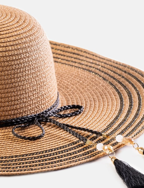 Damski kapelusz plażowy F65/K42 w kolorze ciemno-beżowym z ozdobnymi błyszczącymi, przeszyciami na brzegu ronda. Wokół korony umieszczono czarny, cienki, skóropodobny podwójny warkoczyk, zakończony ozdobnymi koralikami i chwostami. Nowoczesny fason sprawia, że kapelusz będzie pasował każdej kobiecie i pozwoli stworzyć stylowy, wakacyjny look. Struktura i materiał, z którego został wykonany, zapewnia cyrkulację powietrza, co zwiększa komfort użytkowania i bezpieczeństwo przed promieniami UV. Wybierz swój ulubiony kapelusz, który będzie świetnym uzupełnieniem letnich stylizacji. Koniecznie zobacz pozostałe kolory i inne akcesoria plażowe, jakie przygotowaliśmy dla Ciebie w tym sezonie.