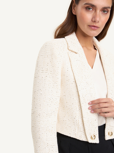 Elegancka krótka marynarka wykonana z tkaniny żakardowej o subtelnej fakturze i dominującym kolorze ecru. Klasyczny fason z klapami oraz ozdobnymi złotymi guzikami dodają jej szyku i wyrafinowania. Wygodna podszewka z dodatkiem elastanu zapewnia komfort noszenia i doskonałe dopasowanie do sylwetki.