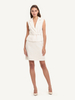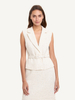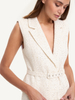 Stylowa kamizelka z tkaniny żakardowej w kolorze ecru, idealna do eleganckich stylizacji. Model bez rękawów podkreślony paskiem w talii, który dodaje sylwetce kobiecych proporcji. Klasyczny wykładany kołnierz nadaje całości szykownego wyglądu.
