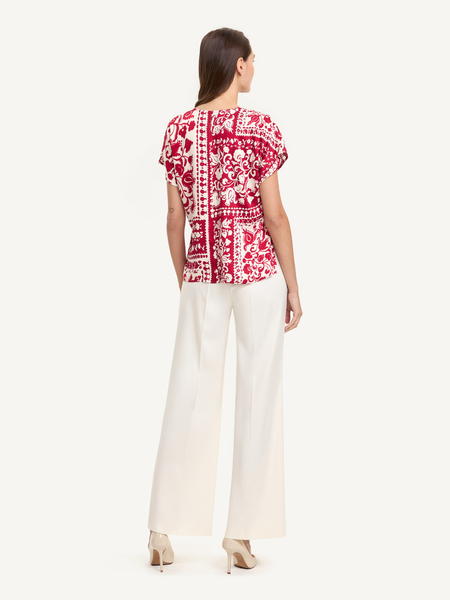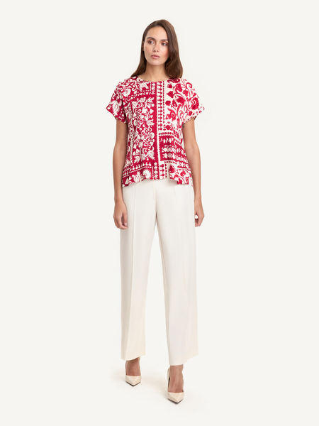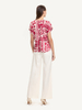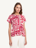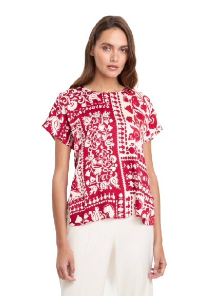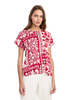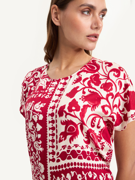 Stylowa bluzka o luźnym kroju, wykonana z lekkiej i przewiewnej wiskozy, idealnej na ciepłe dni. Model charakteryzuje się efektownym nadrukiem w stylu patchworkowym, który nadaje całości oryginalnego wyglądu. Okrągły dekolt i krótkie rękawy zapewniają komfort noszenia, a subtelne zapięcie na guzik z tyłu dodaje elegancji.
