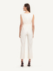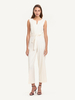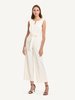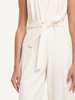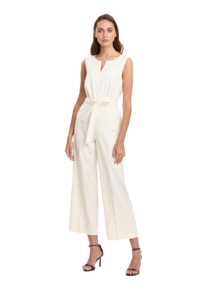Elegancki kombinezon w odcieniu ecru to doskonały wybór na wyjątkowe okazje. Jego minimalistyczny design z okrągłym dekoltem i subtelnym rozcięciem sprawia, że prezentuje się niezwykle stylowo. Bezrękawowa forma podkreśla ramiona, a dołączony pasek pięknie akcentuje talię, nadając sylwetce proporcji.