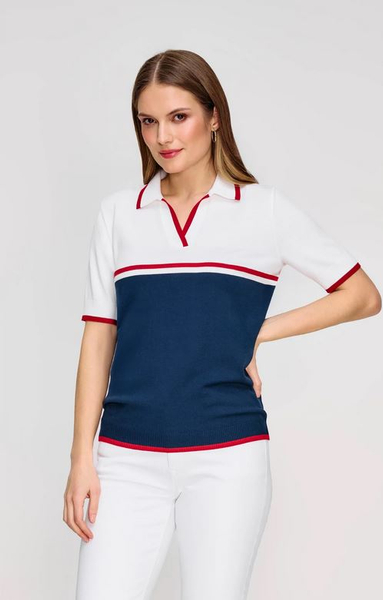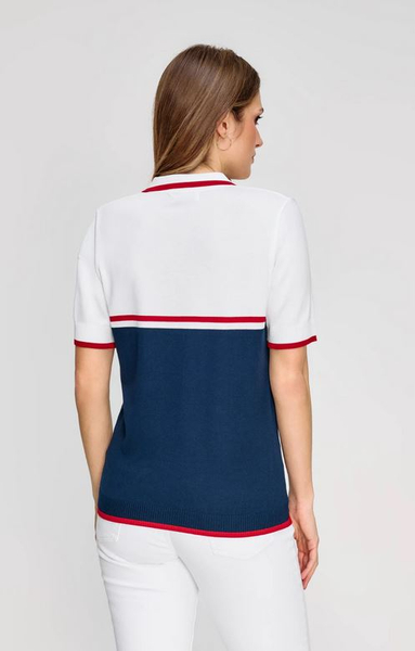 Stylowa i ponadczasowa bluzka z krótkim rękawem i kołnierzykiem polo, wykonana z wysokiej jakości wiskozowej przędzy. Lekka, przewiewna i niezwykle komfortowa – doskonała na wiosenne i letnie dni. Klasyczne połączenie granatu i bieli z czerwonymi akcentami nadaje jej wyrazistego, a zarazem eleganckiego charakteru, inspirowanego marynistycznym stylem. Świetnie komponuje się zarówno z jeansami, jak i spódnicą, tworząc szykowne, a zarazem casualowe stylizacje.