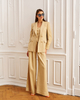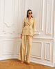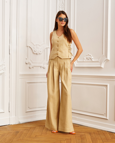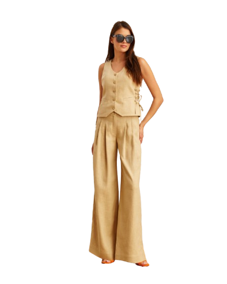 To spodnie, które od razu robią wrażenie. Uszyte z naturalnej tkaniny (ramia z bawełną), łączą w sobie styl, wygodę i perfekcyjne wykończenie. Szerokie nogawki i wysoki stan optycznie wydłużają nogi, a subtelne zakładki dodają całości lekkości i klasy.