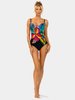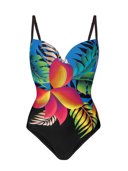 Strój kąpielowy F28C/900 z kolekcji Floral Fantasy to propozycja dla kobiet ceniących połączenie nowoczesnego designu z klasyczną elegancją. Tropikalny kwiatowy print w intensywnych kolorach na tle głębokiej czerni podkreśla letnią opaleniznę i przyciąga wzrok. Fason ten charakteryzuje dekolt w kształcie "serduszka", który niezwykle subtelnie podkreśla i eksponuje biust.