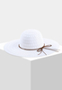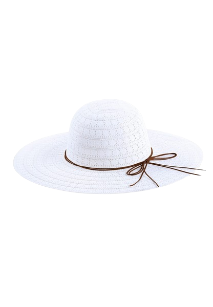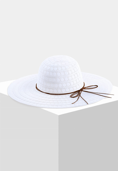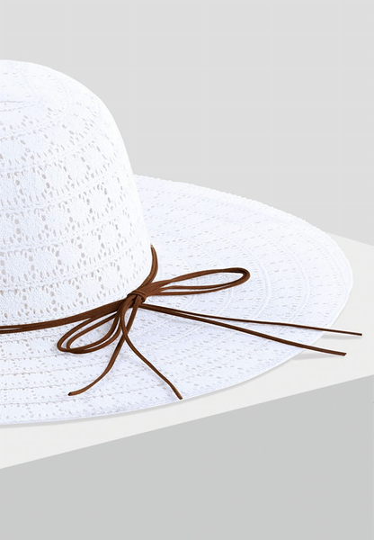 Ażurowy biały kapelusz plażowy z brązowym ozdobnym rzemykiem
