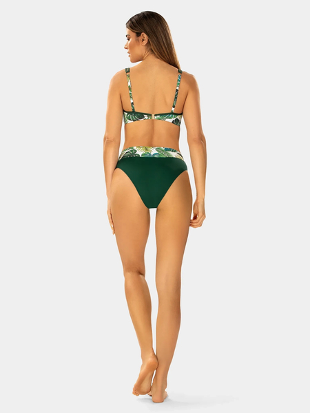 Ta góra od bikini wyposażona jest w usztywniane miseczki typu medium z wyjmowanym bocznym push-upem, które modelują biust i zapewniają optymalne podtrzymanie. Fiszbiny dodatkowo stabilizują konstrukcję, a podwójne ramiączka z możliwością regulacji gwarantują indywidualne dopasowanie. Tył zapinany na klasyczny zatrzask oraz boczki wzmocnione siateczką stabilizującą podkreślają precyzję wykonania i komfort użytkowania. Tropikalne wzory w połączeniu z ciemnozielonym lamowaniem tworzą harmonijną całość, która przyciąga uwagę i podkreśla opaleniznę.