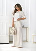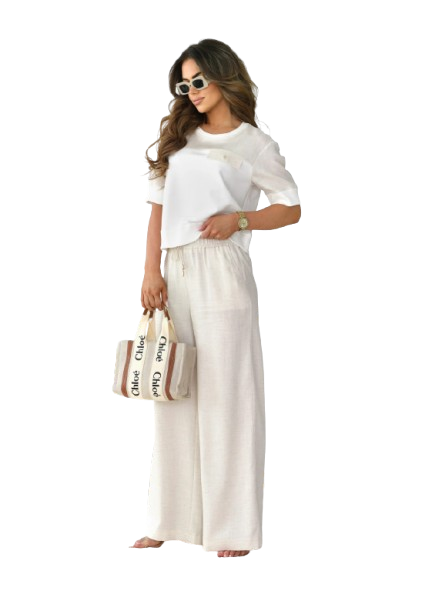 Lekkie, szerokie spodnie w jasnym kolorze, wykonane z przewiewnej tkaniny o subtelnie melanżowej fakturze. Luźny, komfortowy krój zapewnia swobodę ruchu, a elastyczna talia ze sznurkiem umożliwia idealne dopasowanie do sylwetki. Sznurek zakończony jest złotymi metalowymi końcówkami, które dodają całości eleganckiego akcentu. Nogawki są proste i lekko wydłużone, co podkreśla ich nonszalancki, lekko zwiewny charakter.
