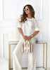Krótka bluzka w jasnym odcieniu, łącząca różne faktury materiałów. Przód i dół wykonane są z gładkiej tkaniny, natomiast rękawy oraz górna część posiadają lekką dzianinę, nadającą całości delikatności i lekkości. Okrągły dekolt wykończony jest szerokim, elastycznym ściągaczem. Na lewej piersi znajduje się ozdobna kieszonka z klapką i metalową aplikacją w złotym odcieniu. Rękawy zakończone są szerokim, dopasowanym mankietem, podkreślającym casualowy charakter bluzki.