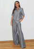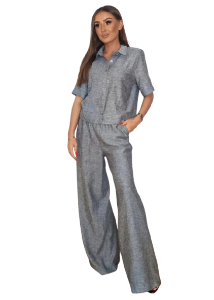z wysokim stanem i szeroką nogawką, wykonane z tego samego melanżowego materiału