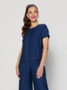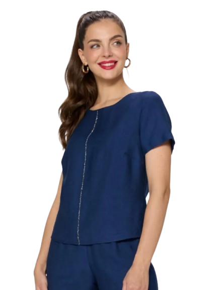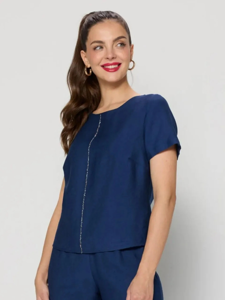 Zwiewna, lekka bluzka marki Salko w kolorze granatu to idealny wybór na eleganckie okazje i letnie dni. Wykonana z delikatnego, cienkiego materiału, zapewnia komfort noszenia i subtelny wygląd. Krótki rękaw oraz prosty krój podkreślają kobiecy charakter, a ozdobna taśma z cyrkonii biegnąca przez środek dodaje stylizacji wyjątkowego blasku. To połączenie klasy i subtelnej elegancji, które sprawdzi się zarówno w biurze, jak i podczas wieczornych wyjść.