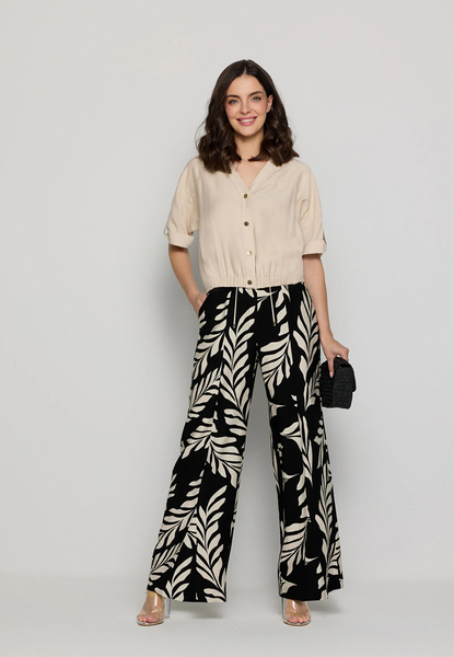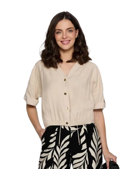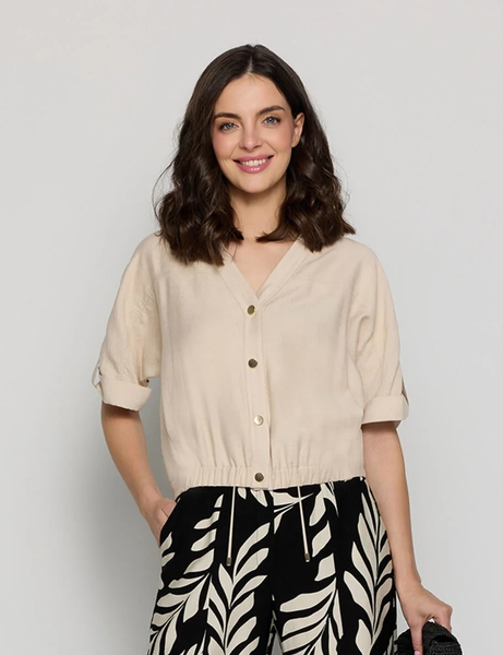 Stylowa, krótka bluzka z wiskozy w beżowym kolorze to idealna propozycja na lato. Model zapinany na dekoracyjne napy, z dekoltem w szpic i krótkim, podwijanym rękawem, łączy swobodę z elegancją. Gumka w dolnej części subtelnie podkreśla sylwetkę i zapewnia idealne dopasowanie. Doskonała zarówno do jeansów, jak i spódnicy – na co dzień i na wyjście.