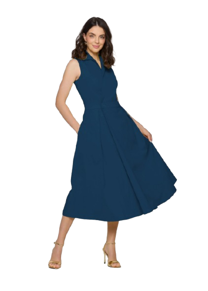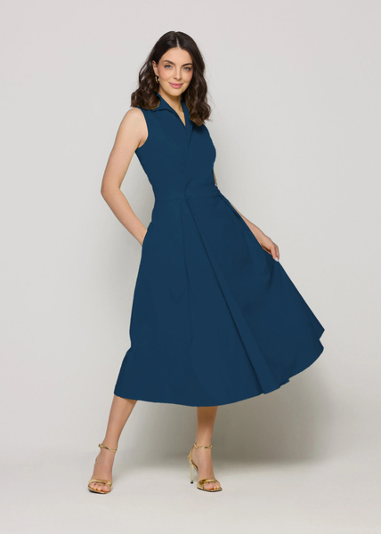 Elegancka sukienka marki Salko w pięknym, niebieskim kolorze to połączenie klasyki i kobiecego stylu. Dopasowana góra z kołnierzykiem i zapięciem na guziki podkreśla talię i nadaje sylwetce smukłości. Rozkloszowany dół zapewnia lekkość i swobodę ruchów, a brak rękawów czyni ten model idealnym wyborem na cieplejsze dni. Długość midi sprawia, że sukienka doskonale sprawdzi się zarówno w codziennych, jak i bardziej formalnych stylizacjach.