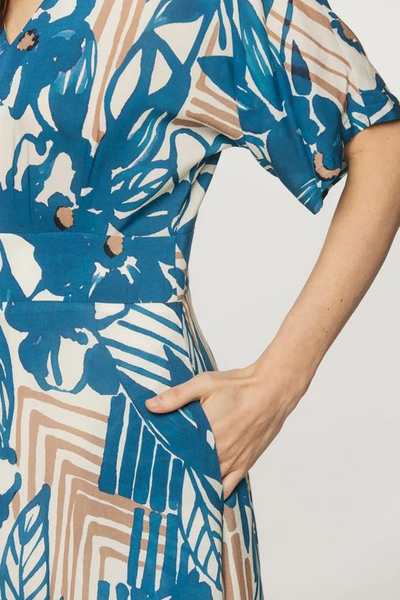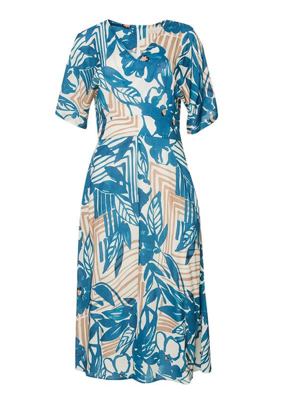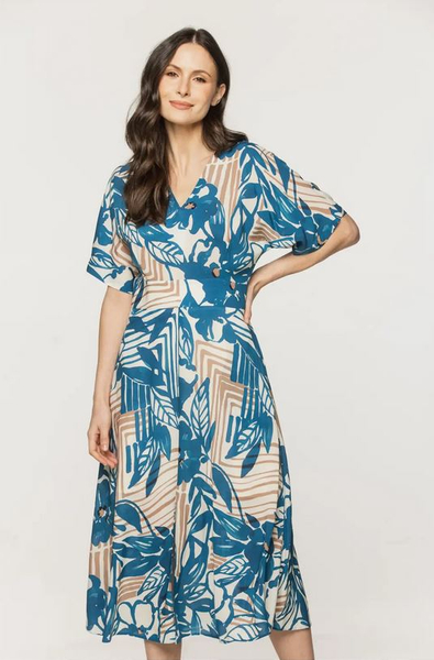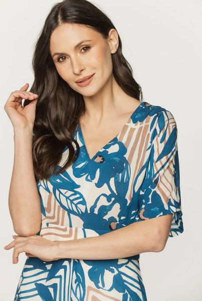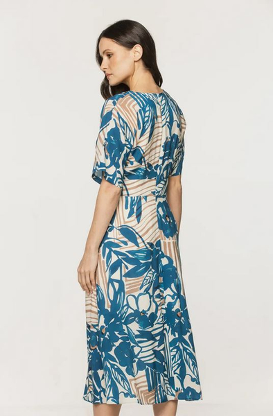 Rozkloszowana sukienka midi wykonana z lekkiej, delikatnej wiskozy, z podszewką z tego samego materiału (100% wiskoza), co gwarantuje wygodę i przewiewność. Model zapinany z tyłu na subtelny, kryty suwak, który nie zaburza linii sylwetki. Zwiewna i kobieca – idealna na letnie przyjęcia, spacery czy eleganckie wyjścia.