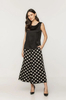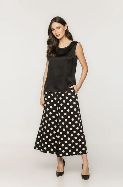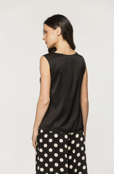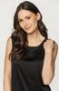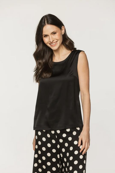 Luźny top z satynowym wykończeniem w kolorze głębokiej czerni, wykonany z lekkiej, lekko elastycznej tkaniny (52% wiskoza, 45% rayon, 3% elastan). Zwiewny i przyjemny w dotyku, zapewnia komfort noszenia nawet w upalne dni. Uniwersalny krój i eleganckie wykończenie sprawiają, że doskonale komponuje się zarówno z codziennymi, jak i bardziej wyszukanymi stylizacjami.
