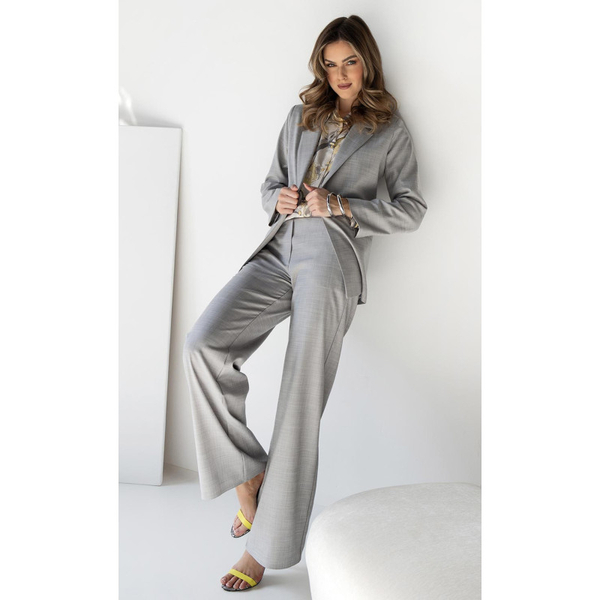 Marynarka damska zapinana jest z przodu na guzik, co zapewnia jej klasyczny charakter, a długie rękawy dodają jej formalnego, a zarazem kobiecego stylu. Praktyczne kieszenie są zarówno funkcjonalnym, jak i stylowym akcentem. Ozdobna podszewka dopełnia całość, nadając marynarce luksusowego wykończenia. Dzięki temu model świetnie komponuje się z szerokimi spodniami z tego samego materiału, tworząc modny garnitur damski.
