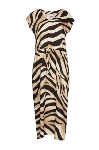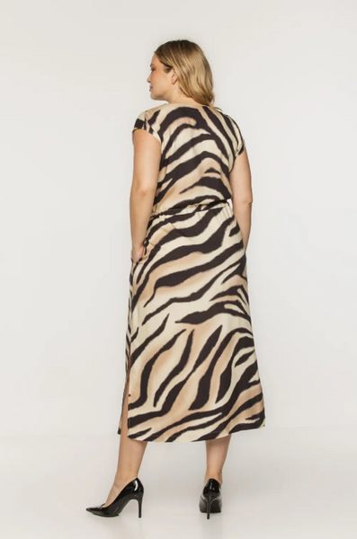 Stylowa sukienka o swobodnym kroju, wykonana w 100% z przewiewnej wiskozy, zapewnia komfort noszenia nawet w ciepłe dni. Wyróżnia się modnym zwierzęcym printem oraz praktycznym troczkiem w talii, który pozwala na dopasowanie sylwetki. Sukienka posiada funkcjonalne kieszenie w bocznych szwach oraz subtelne rozcięcia po bokach, które dodają jej lekkości i kobiecego charakteru.