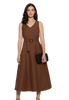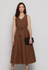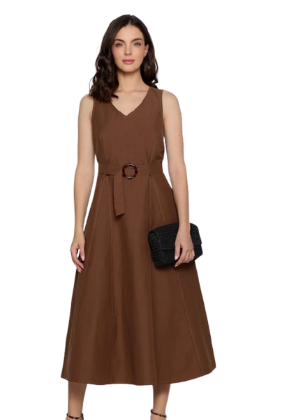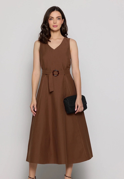 Podkreśl swoją kobiecość z elegancką sukienką marki Salko, stworzoną z myślą o letnich dniach. Model taliowany midi w kolorze głębokiej czekolady to kwintesencja stylu i wygody. Bez rękawków, z subtelnym dekoltem w szpic i paskiem w talii, doskonale eksponuje sylwetkę, jednocześnie zapewniając swobodę ruchów.